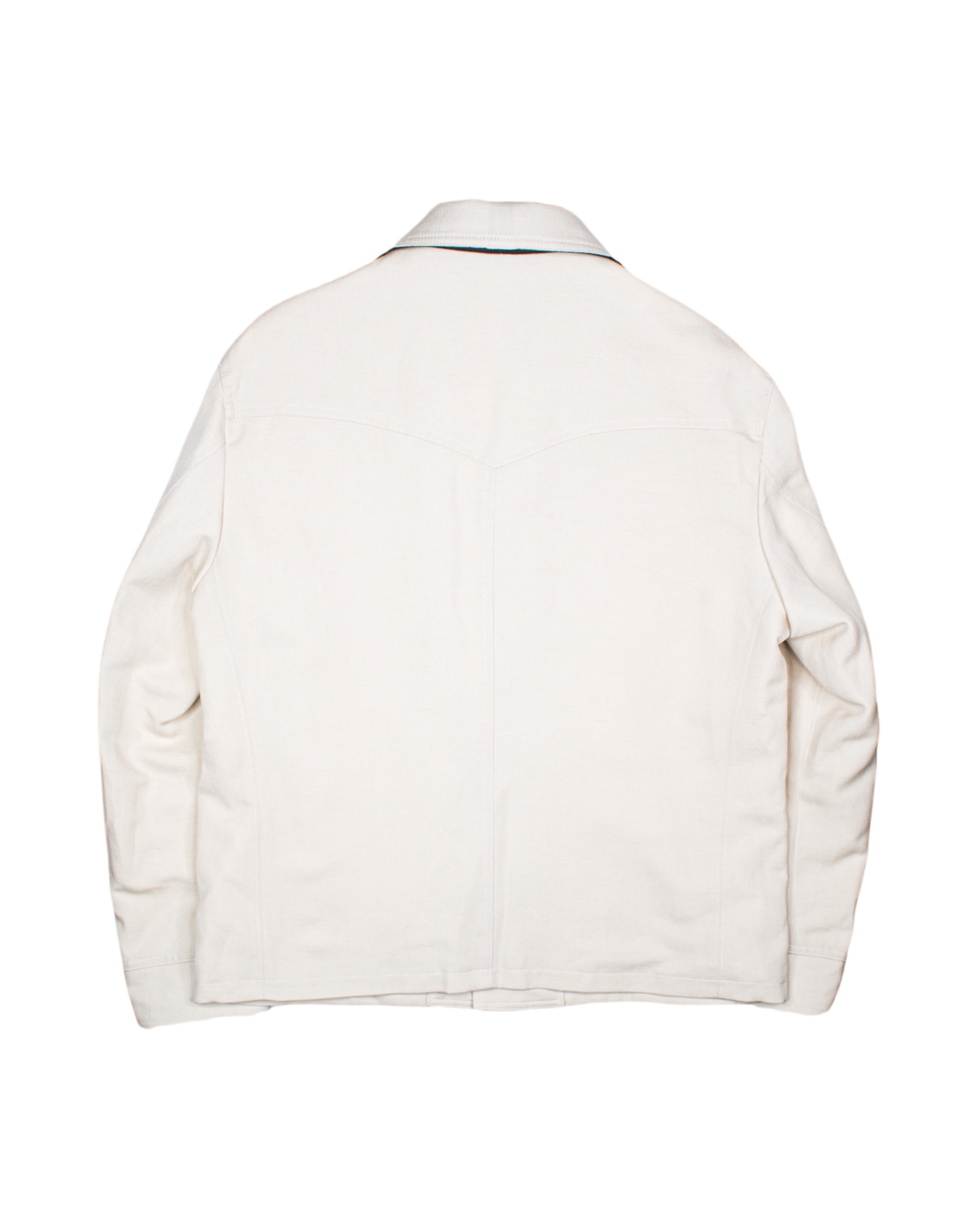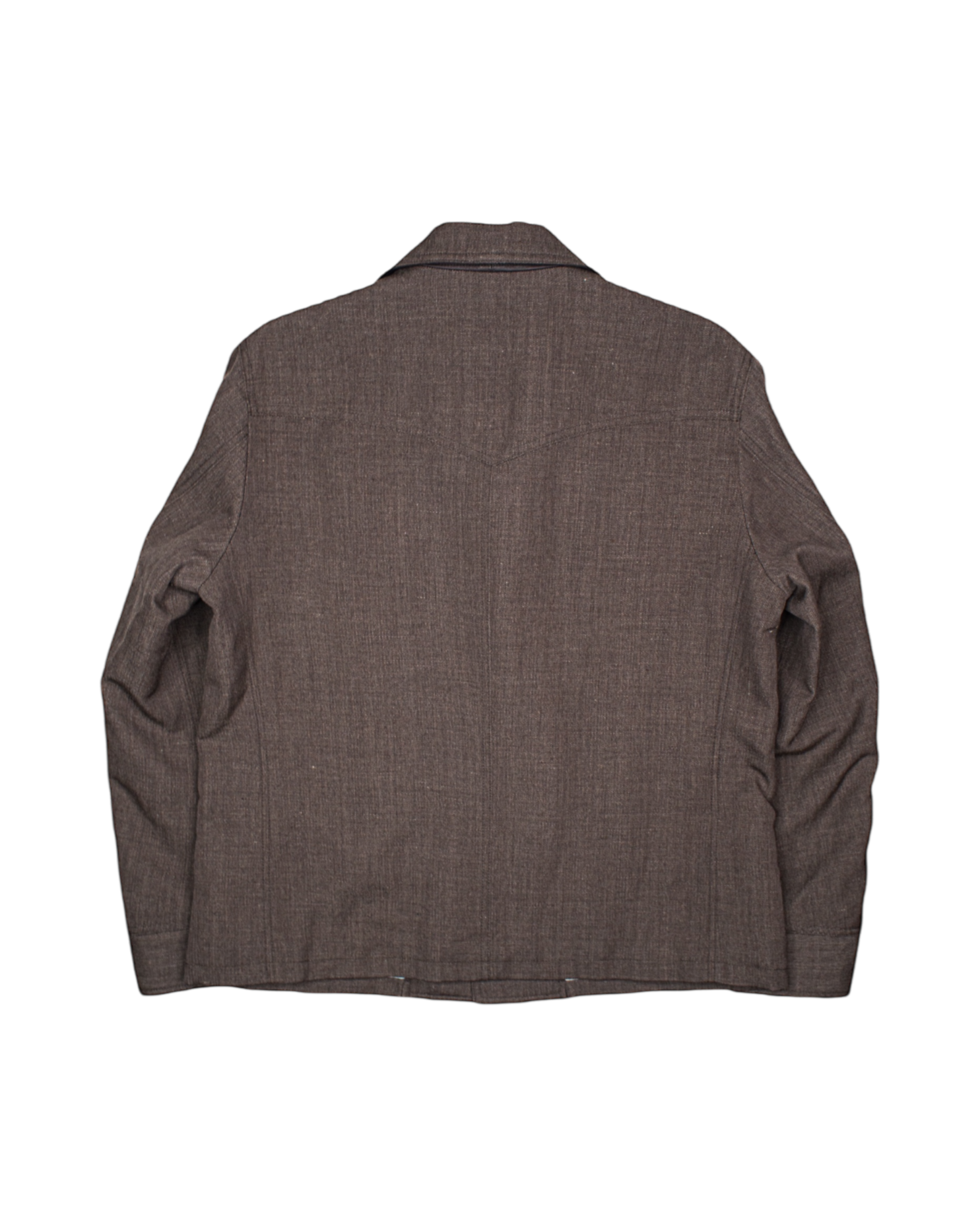 The coat is short in length with a boxy silhouette. The back features a Western yoke.