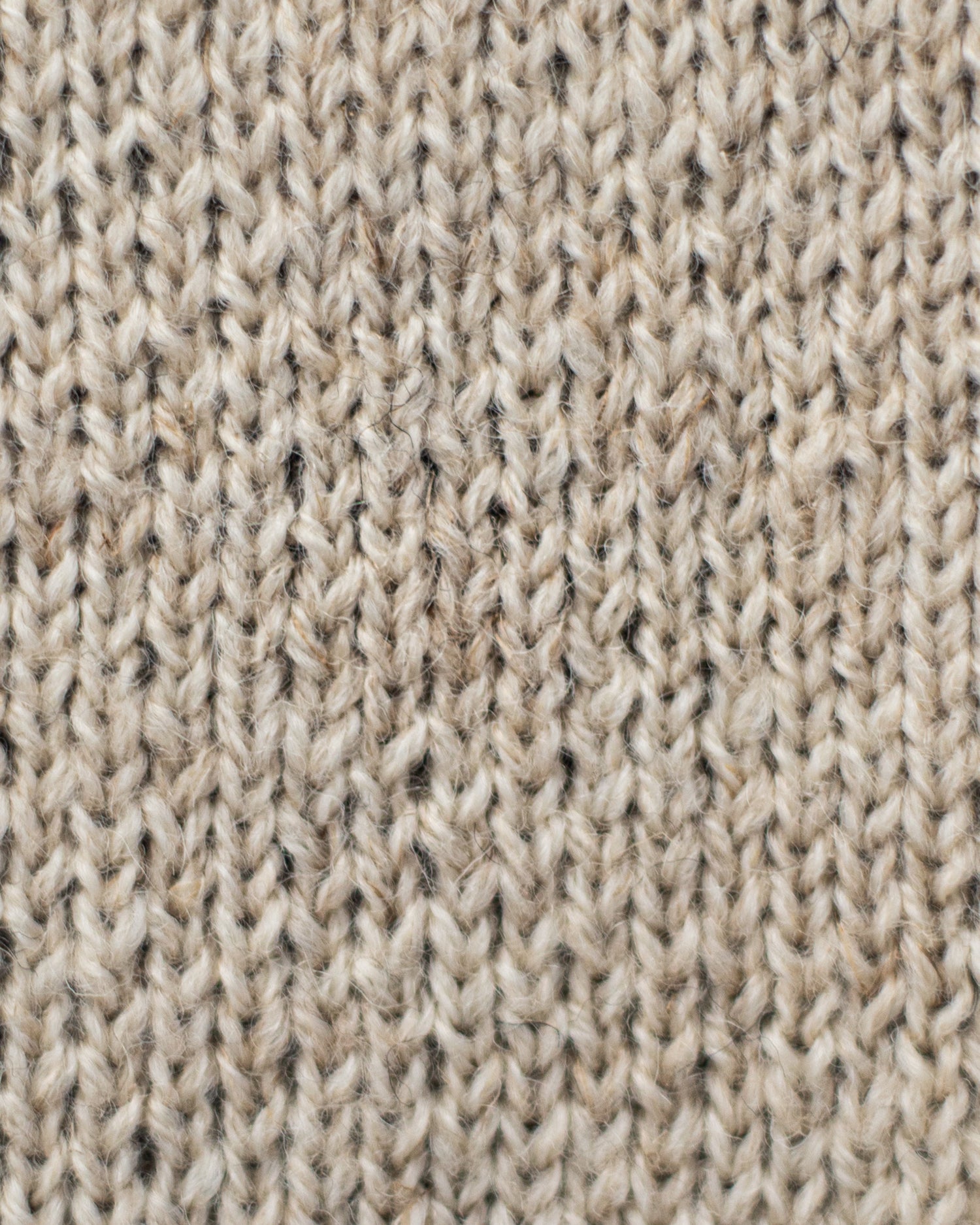 素材は、シェットランドウールにリネンを混紡して出来た糸で編み上げ、粗野な中に柔らかな印象もありつつ、リネンのドライ感とシェットランドウールの粗野さがマッチした独自な風合いのニットとなります。