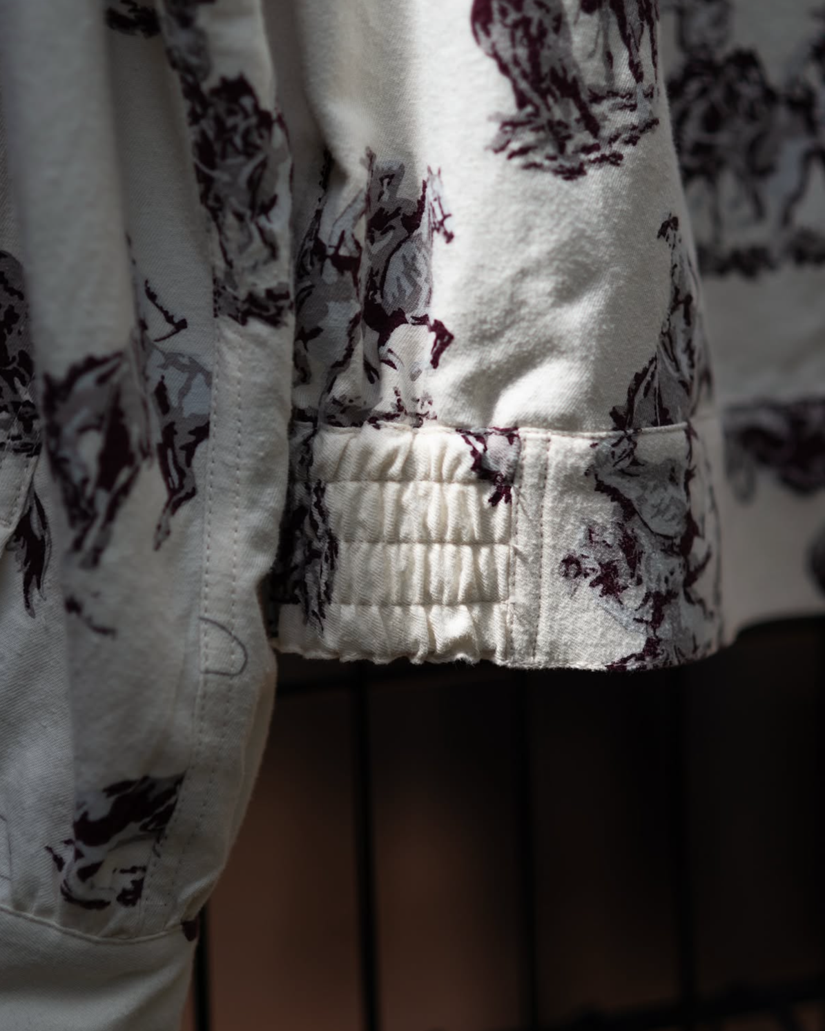素材は、オリジナルのカウボーイ柄をヴィンテージの様な着込んだ風合いを出すために打ち込みをわざと甘く織って、ツイル素材をソフトで軽く仕上げるためピーチ起毛やウォッシュなど加工して風合いに拘った素材。