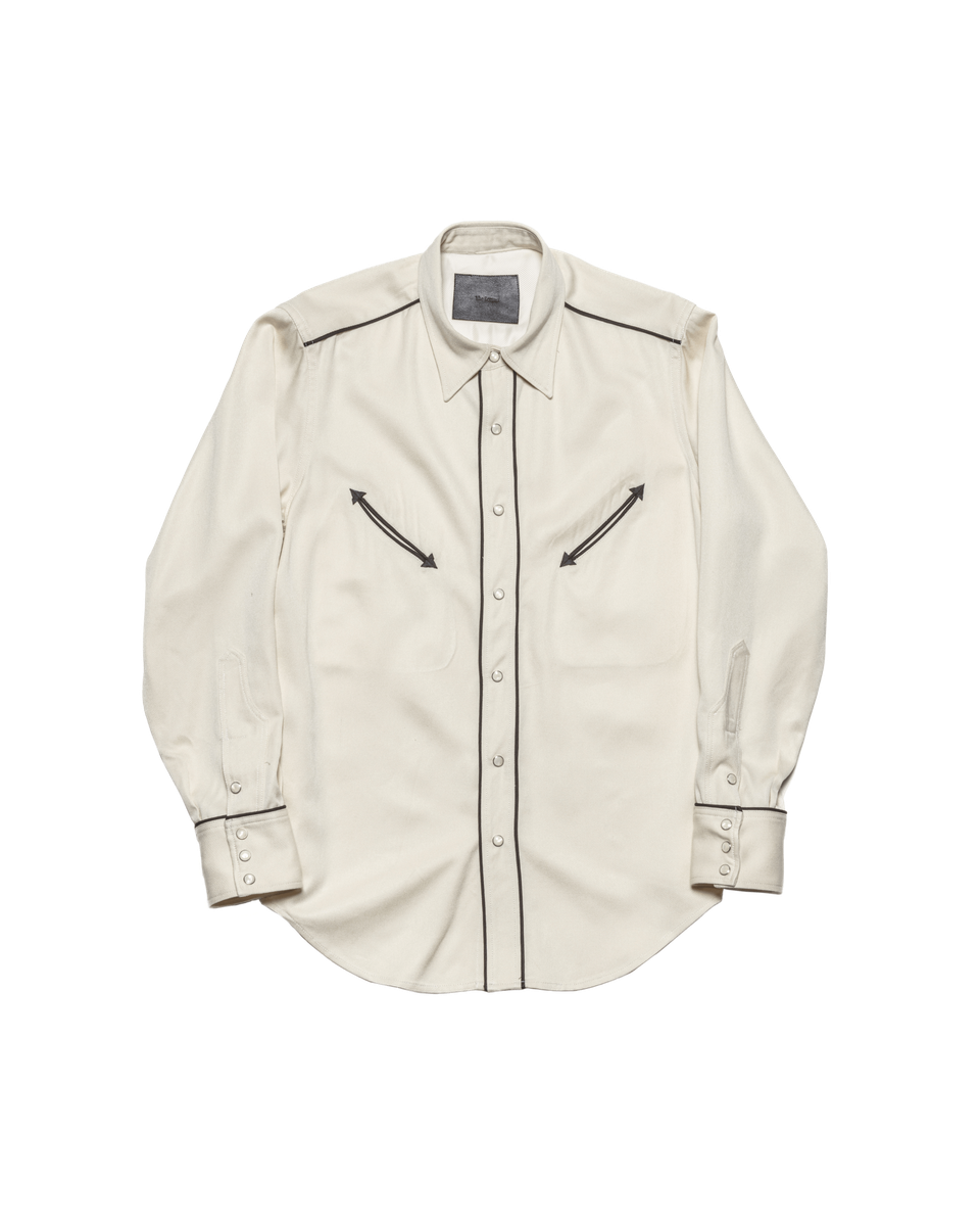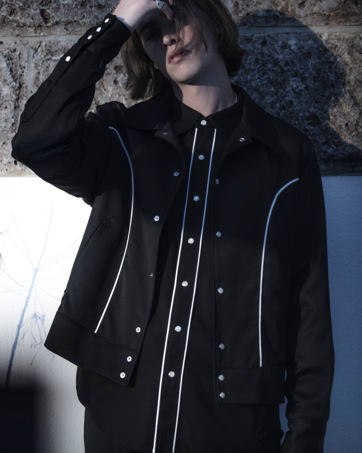 フロントのスマイルポケットやフロント、肩、背面のヨークはパイピングでアクセントを付け、剣ボロ部分のカッティングにウエスタンディテールを施した一着。
