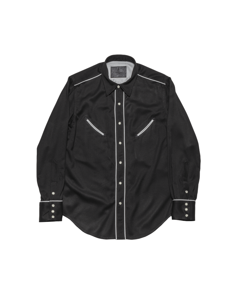 The front smile pocket, front, shoulders, and back yoke are accented with piping, and the swordbones are cut with western detailing.