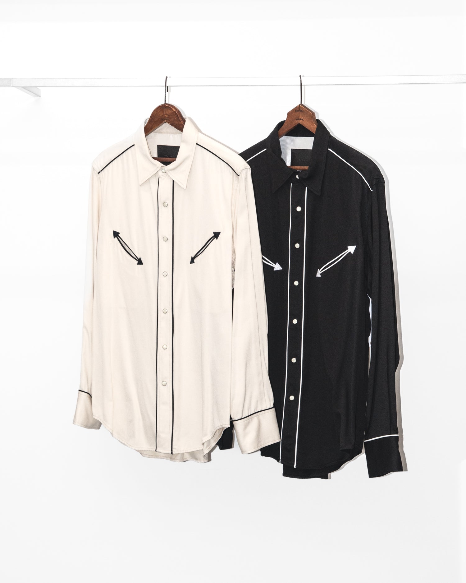 レーヨンギャバジン素材のスマイルポケットシャツ。